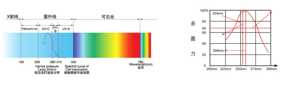 紫外線是介于可視光線和X射線之間的電磁波頻譜。200nm至400nm的紫外光譜有很強(qiáng)的殺菌效力, 其峰值在265nm。 在這個(gè)波長(zhǎng)范圍內(nèi)的紫外線主要是通過刺穿細(xì)胞膜,破壞細(xì)胞內(nèi)脫氧核糖核酸和破壞細(xì)胞內(nèi)的其它分子,使微生物不能再?gòu)?fù)制和繁殖,而最終達(dá)到消毒作用。 紫外線殺菌器實(shí)物拍攝依照波長(zhǎng)范圍,可將紫外線分為4個(gè)波段:
